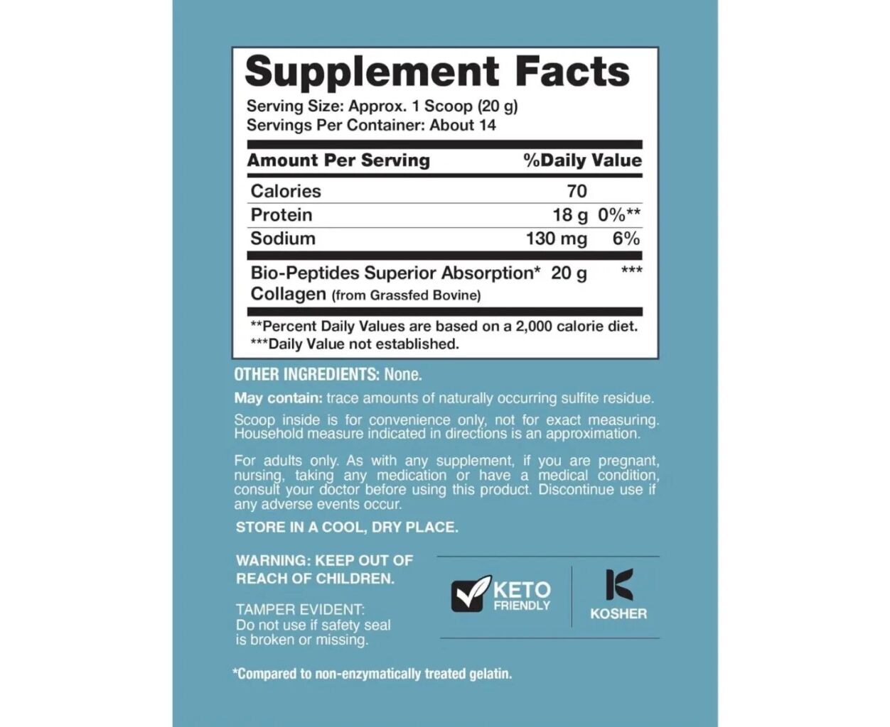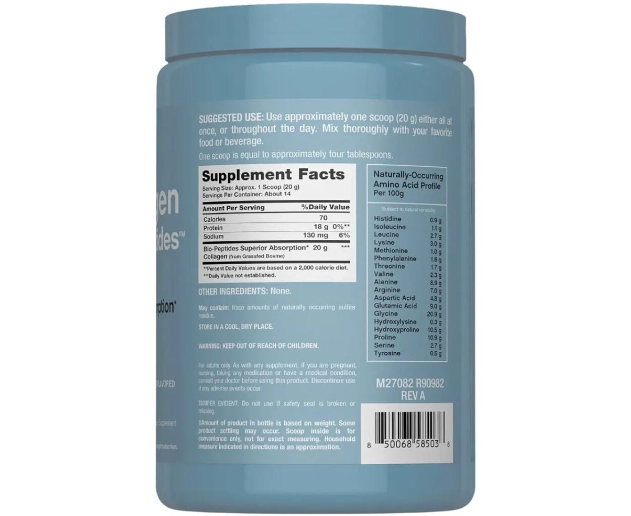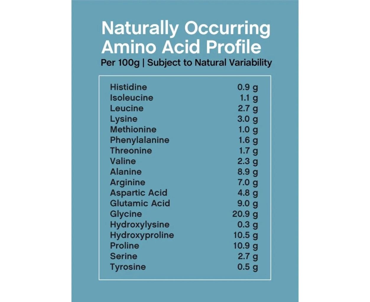• білок 18 г 0%**, Натрій 130 мг 6%, Колагенові біопептиди чудового засвоєння (з корів, вирощених на трав'яному відгодівлі) 20 г ***, Профіль природних амінокислот на 100 г, Гістідін 0,9 г, Ізолейцин 1,1 г, Лейцин 2,7 г, Лізін 3 г, Метіонін 1 г, Фенілаланін
