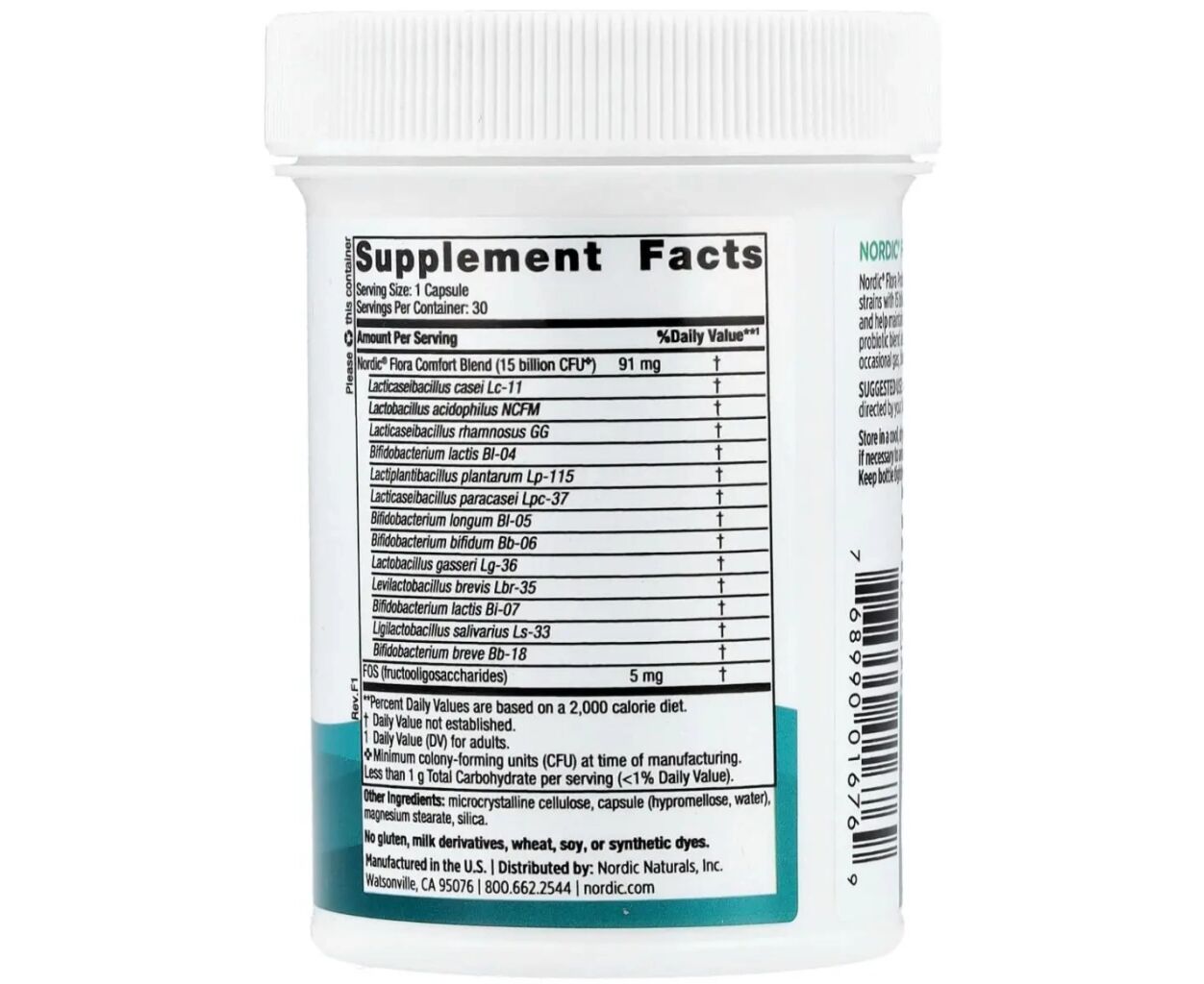 - комфортна суміш Nordic® Flora (15 млрд КУО*) 91 мг †, Lacticaseibacillus casei Lc-11, ацидофільні лактобактерії (Lactobacillus acidophilus) NCFM, Lacticaseibacillus rhamnosus GG, Біфідобактерії лактис BI-04, Lactiplantibacillus plantarum (Lp-115), Lactica