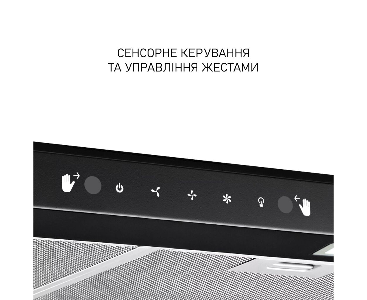 Тип - плоска, в шафу, 450 м3/год, 80 Вт, 1, відведення повітря і рециркуляція, ширина корпусу - 59.5 см, - алюмінієвий, Тип управління - сенсорне + жести, Матеріал корпусу - фарбований метал, Лампи - LED 2х1.5 Вт, 54 дб, 85 х 595 х 440 мм, 3.9 кг, чорний