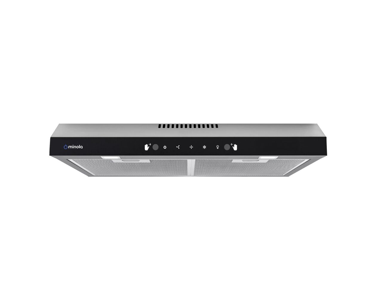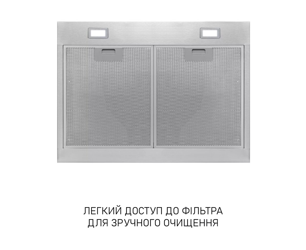 Тип - плоска, в шафу, 450 м3/год, 80 Вт, 1, відведення повітря і рециркуляція, ширина корпусу - 59.5 см, - алюмінієвий, Тип управління - сенсорне + жести, Матеріал корпусу - нержавіюча сталь, скло, Лампи - LED 2х1.5 Вт, 54 дб, 85 х 595 х 440 мм, 3.9 кг, нержавіюча сталь