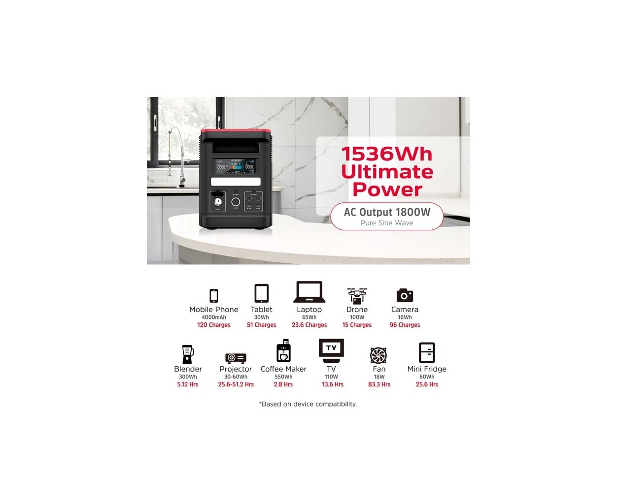 1536 Вт*год, для котлів, для смартфонів, для великої побутової техніки, для будинку, LiFePo4, 1800 Вт, мережа, сонячна панель, авто (прикурювач), З дисплеєм, Швидке заряджання батареї, З ліхтариком, Power Delivery, З ручкою, QC швидка зарядка 3.0, 18 кг