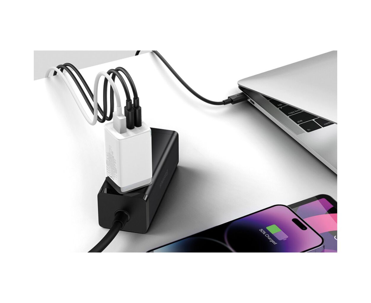 Baseus GaN5 Pro Fast Charger здатний заряджати відразу кілька пристроїв на вищій швидкості. Це реалізовано завдяки оновленій технології BPS 2 (Baseus Power Split 2), тому будь-який з портів Type-C має потужність 65W, якщо використовується один. Крім того, покращені силові GaN-транзистори дозволяють знизити рівень тепла, що виділяється, і підвищити загальну потужність зарядного блоку. Також, за допомогою цього зарядного пристрою з функцією швидкого заряджання, можна заряджати ноутбук Apple MacBook та інші пристрої, які підтримують потужність 65 Вт.