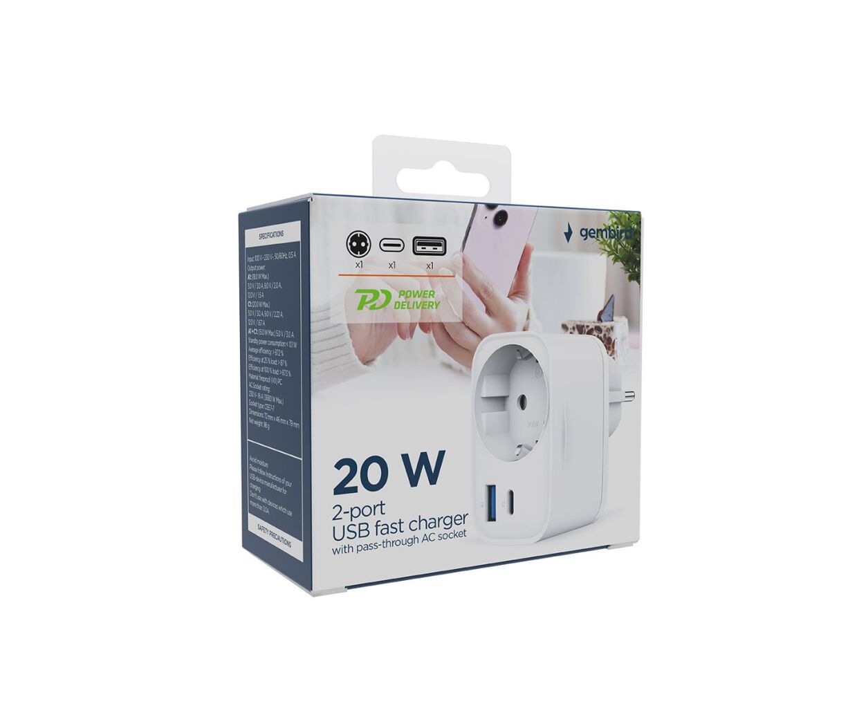 Зарядний пристрій Gembird 1xUSB-C PD20W + 1xUSB QC3.0 + Schuko white (TA-ACPDQC20-01-W)