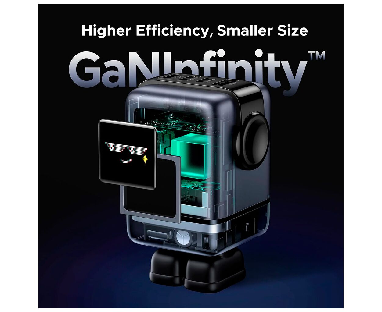 Завдяки вдосконаленому чіпу GaNInfinity, цей зарядний пристрій відрізняється від традиційних, пропонуючи компактність і легкість без втрати продуктивності. Він ідеально підходить для зарядження широкого спектра девайсів — від ноутбуків (зокрема, MacBook), планшетів, смартфонів (включно із серіями iPhone і Galaxy), до гаджетів менших розмірів, таких як TWS навушники, смарт-годинники та фітнес-браслети.