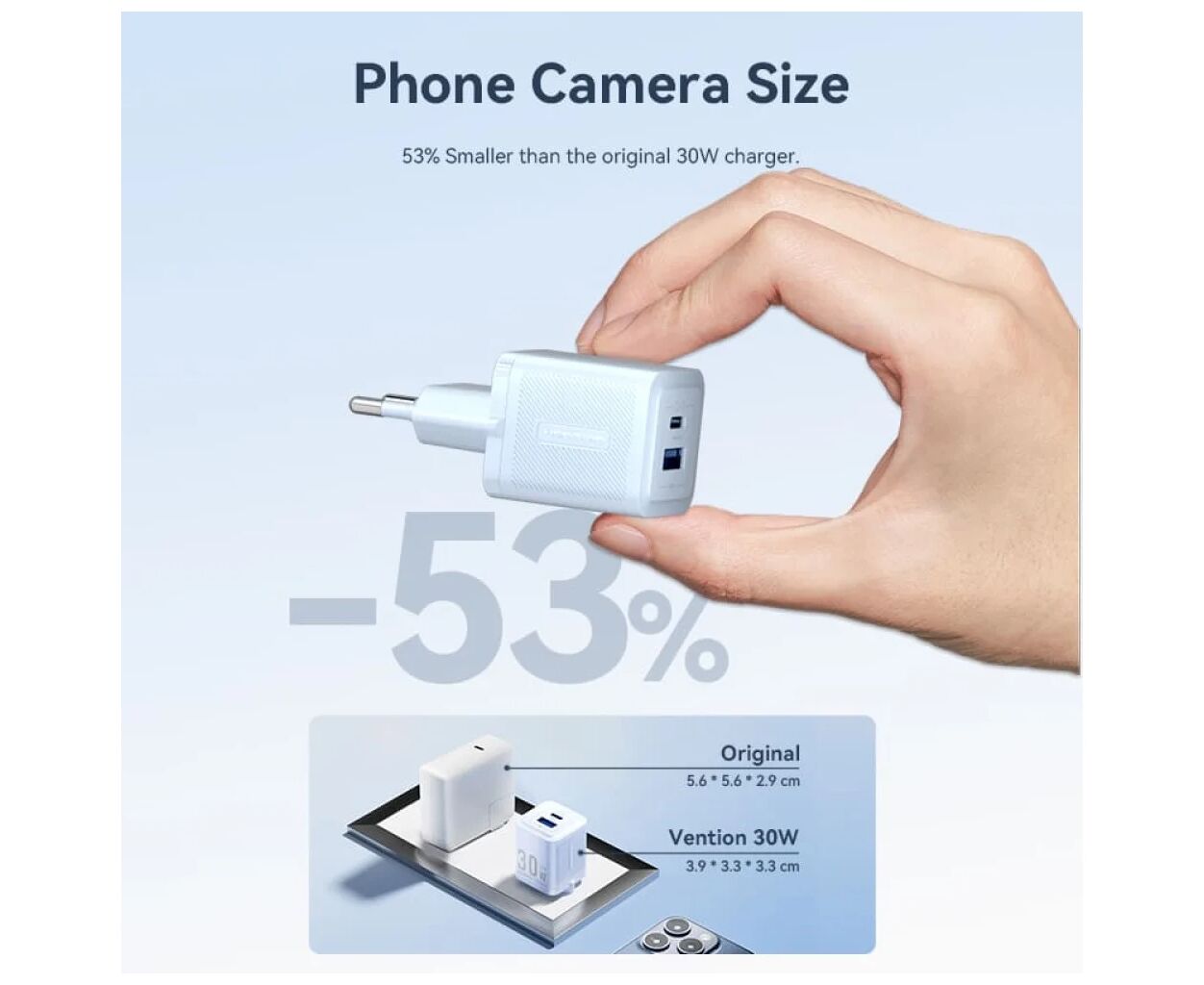 Зарядний пристрій Vention 1xUSB-C PD30W + 1xUSB QC3.0 30W GaN – це інноваційне рішення для швидкої та ефективної зарядки ваших пристроїв. Використання технології Gallium Nitride (GaN) дозволяє зарядному пристрою бути надзвичайно компактним, забезпечуючи при цьому максимальну ефективність зарядки. GaN-технологія робить пристрій на 53% меншим за традиційні аналоги, що значно спрощує його транспортування та використання в будь-яких умовах.