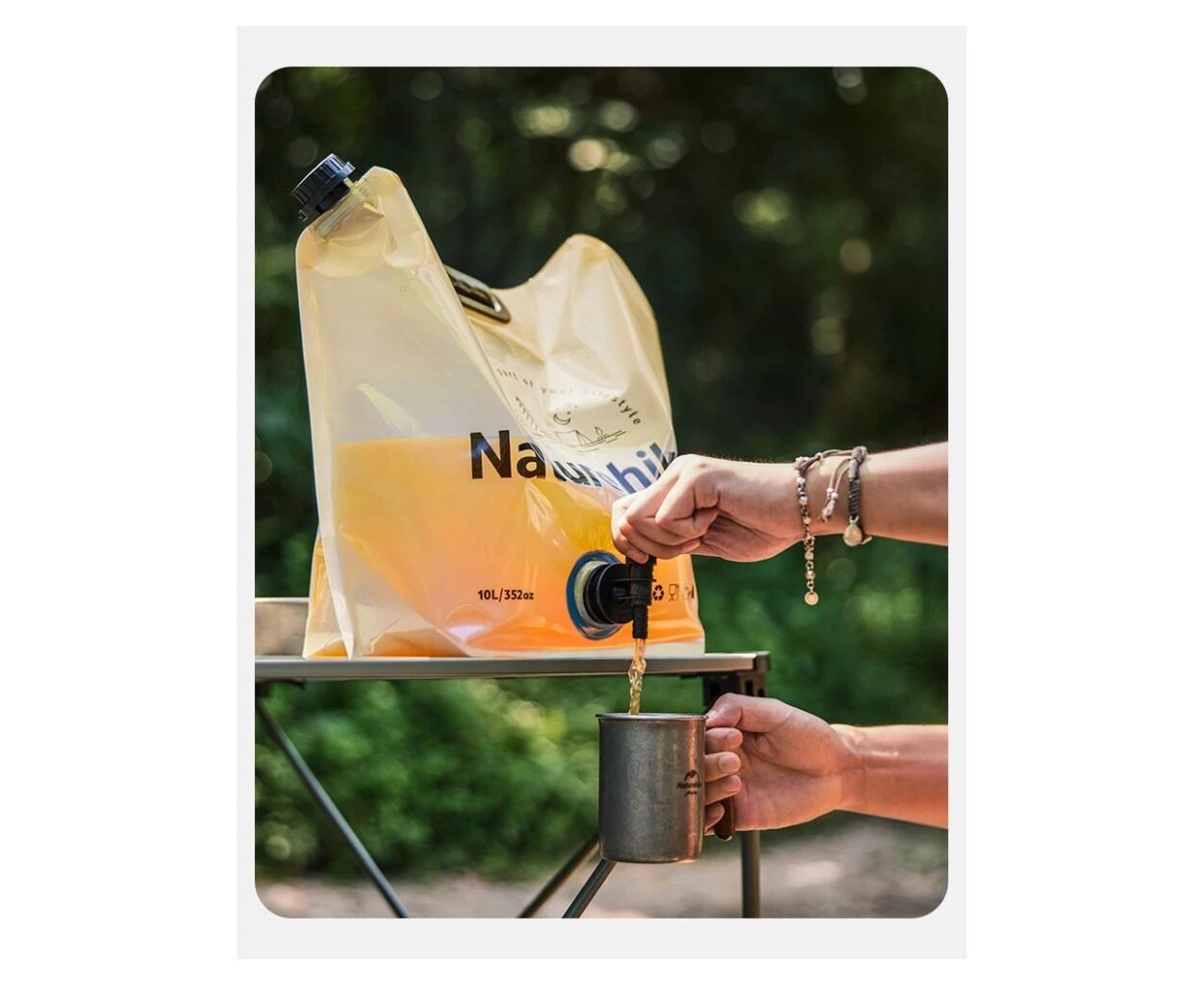 Контейнер от Naturehike разработан для любителей активного отдыха, в том числе кемпинга, походов и пикников. Это изделие является компактной альтернативой обычным пластиковым бутылкам для воды с преимуществами в виде миниатюрных размеров в сложенном виде (только 15 х 12 х 8 см) и наличии небольшого краника для наливания воды.