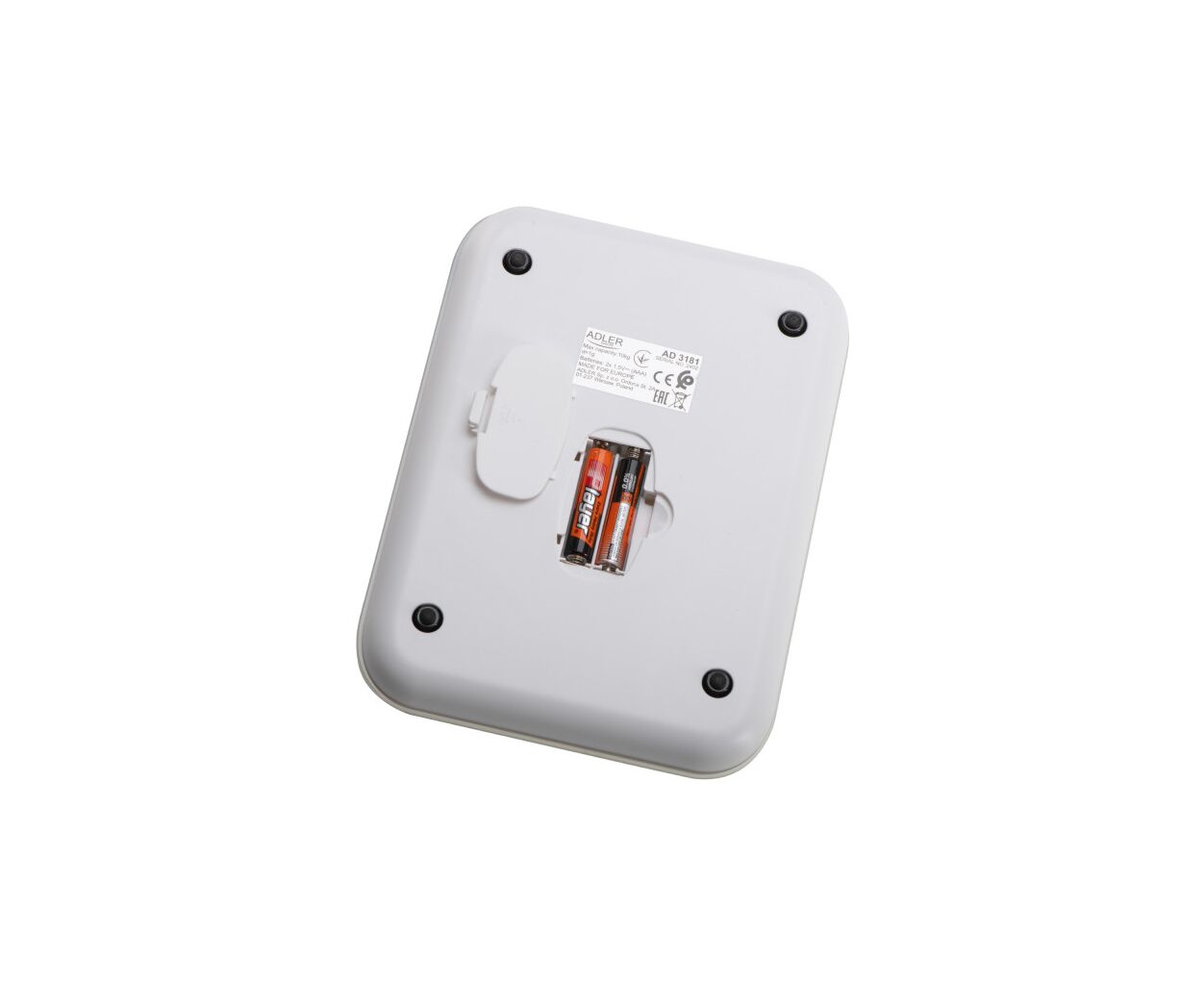 Весы кухонные Adler AD 3181 питаются от двух батареек типа ААА, входящих в комплект поставки. Весы автоматически отключаются при отсутствии нагрузки в течение 2 минут.