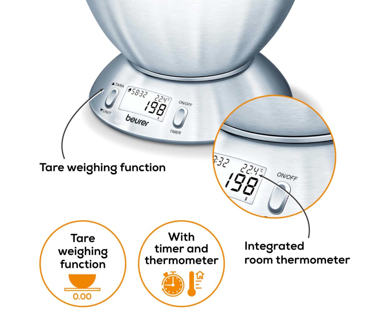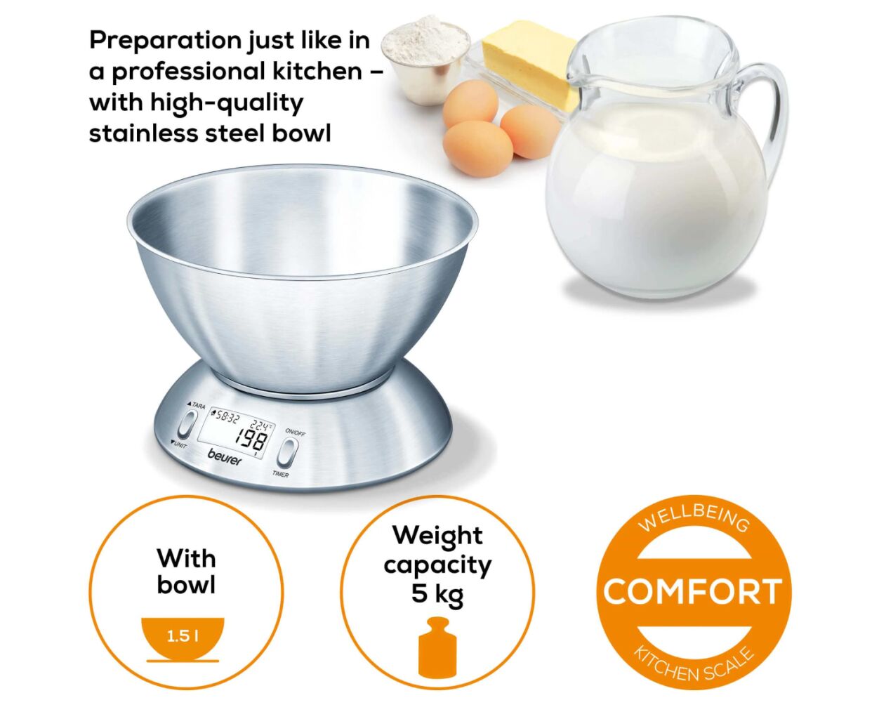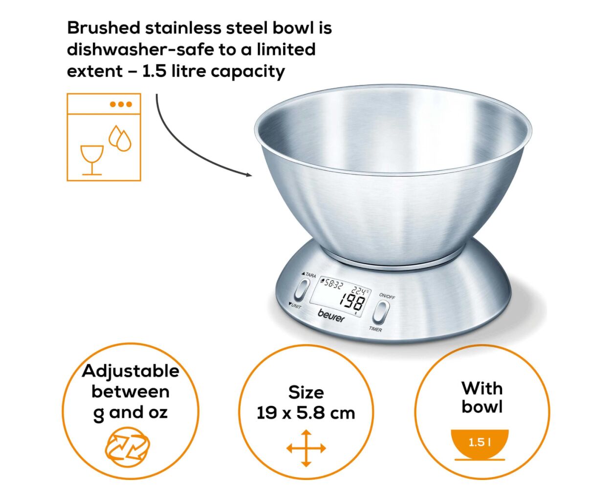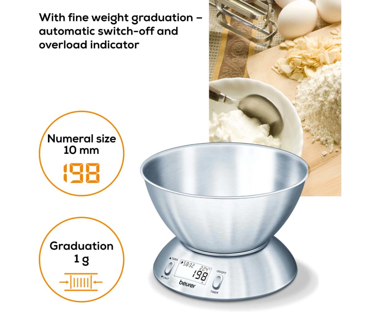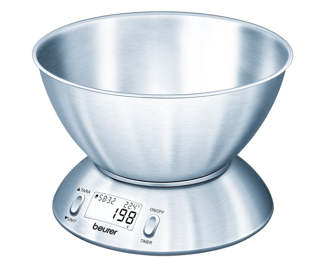 Весы кухонные BEURER KS 54 обладают множеством полезных особенностей, делающих их удобными и многофункциональными. Чаша и корпус выполнены из сатинированной нержавеющей стали, что делает уход за весами легким и комфортным. А чашу для продуктов объемом 1.5 л можно мыть в посудомоечной машине. Чаша рассчитана на вес до 5 кг с точностью измерения до 1 грамма, а измерять продукты Вы можете как в общепринятых в нашей стране граммах и килограммах, так и в унциях.