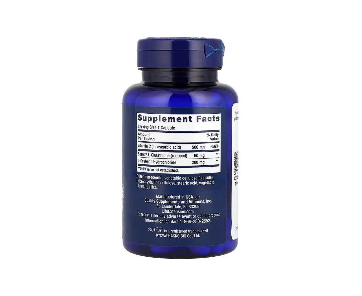 - Витамин C (в виде аскорбиновой кислоты) 500 мг 556%, L-глутатион Setria® (восстановленный) 50 мг, L-цистеина гидрохлорид 200 мг