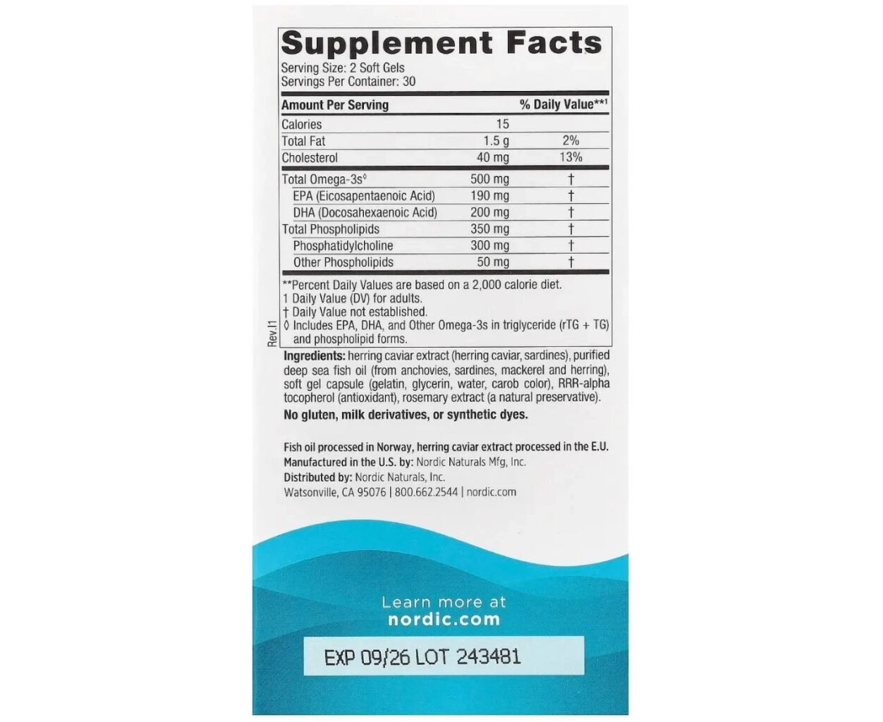 • холестерин 40 мг 13%, Всего омега-3 кислот♢ 500 мг, ЭПК (эйкозапентаеновая кислота) 190 мг, ДГК (докозагексаеновая кислота) 200 мг, Всего фосфолипидов 350 мг, Фосфатидилхолин 300 мг, Другие фосфолипиды 50 мг