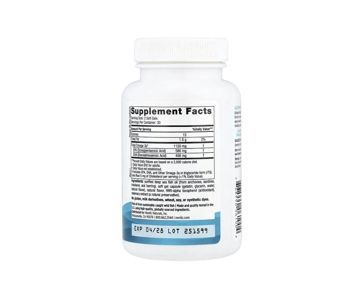 - общее содержание Омега-3♢ 1120 мг, ЭПК (эйкозапентаеновая кислота) 586 мг, ДГК (докозагексаеновая кислота) 456 мг