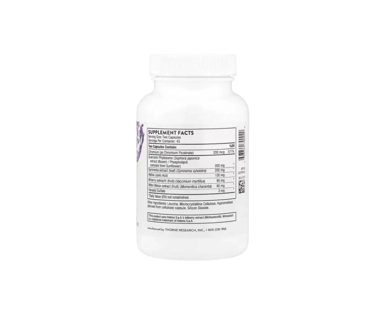 • Хром (в виде пиколината хрома) 200 мкг 571,00%, Фитосома кверцетина (экстракт софоры японской (цветок) / комплекс фосфолипидов из подсолнечника) 200 мг, Экстракт Джимнемы (лист) (Gymnema sylvestre) 200 мг, Альфа-липоевая кислота 100 мг, Экстракт черники†