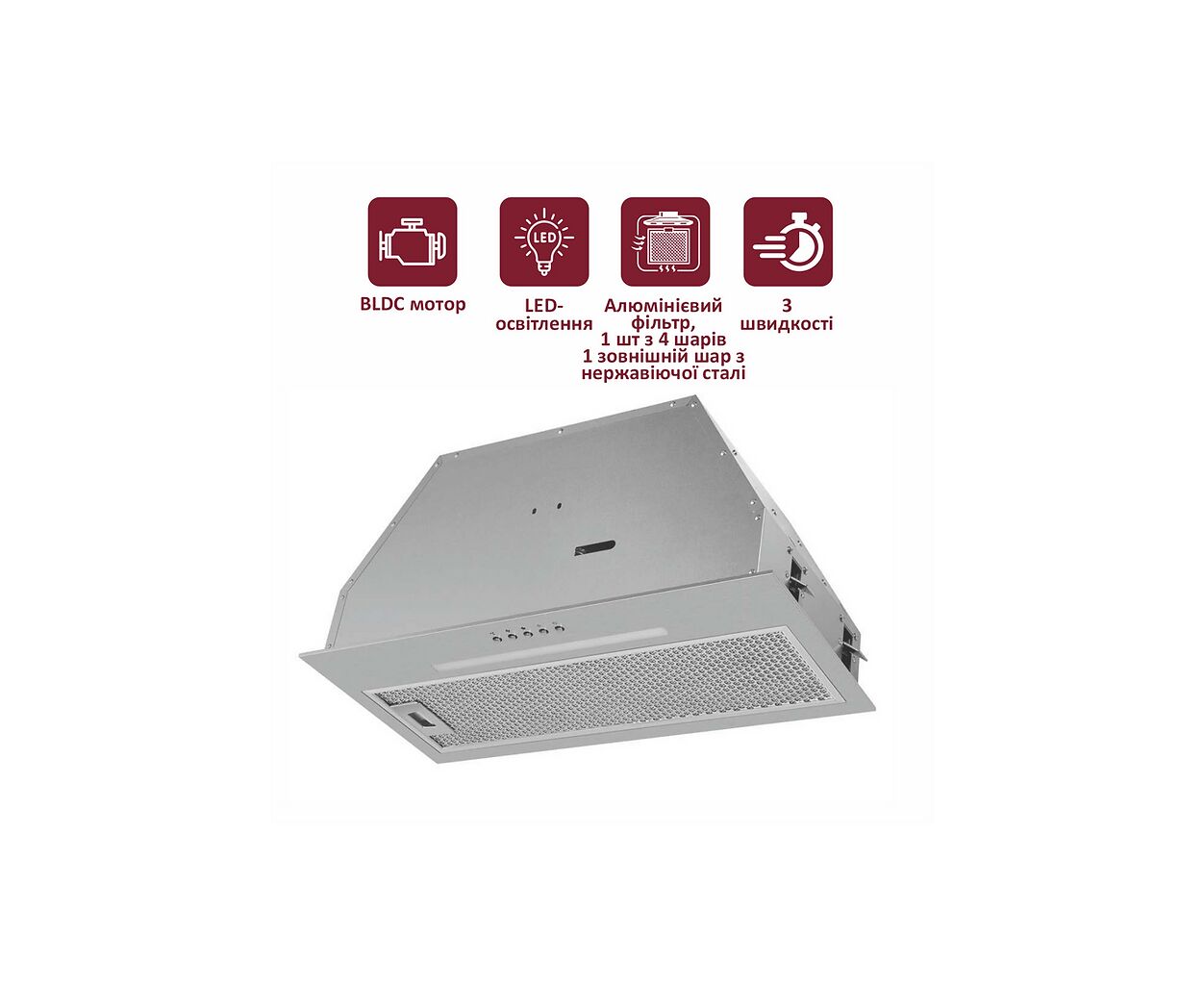 Тип - встраиваемая, в шкаф, 1000 м3/час, 75 Вт, 1, отвод воздуха и рециркуляция, ширина корпуса - 60 см, Диаметр вентиляционной трубы - 150 мм, Фильтры - алюминиевый, Тип управления - кнопочное, Материал корпуса - нержавеющая сталь, Лампы - 1 х 3.5 Вт, 46 - 57 дБ, 277 х 600 х 290 мм, 7 кг, нержавеющая сталь