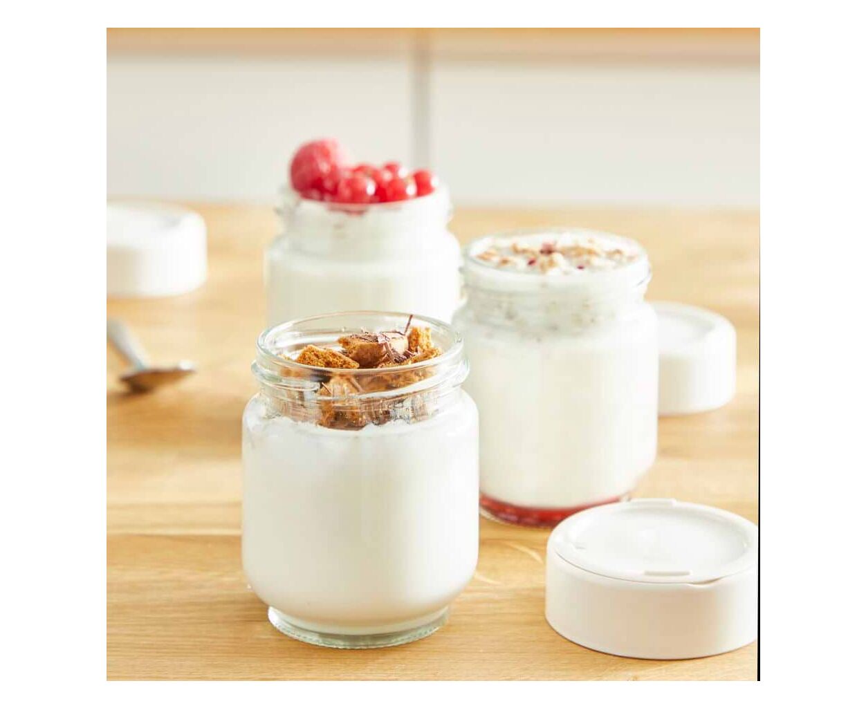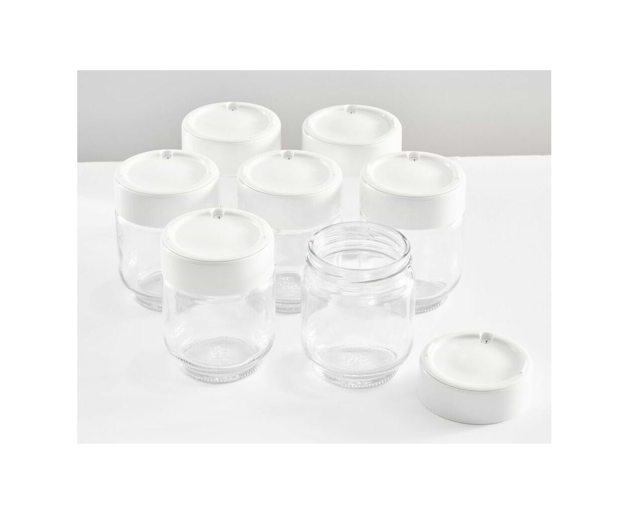 Полный набор, содержащий 7 крепких стеклянных банок для йогурта (160 мл) с крышками, которые можно мыть в посудомоечной машине.