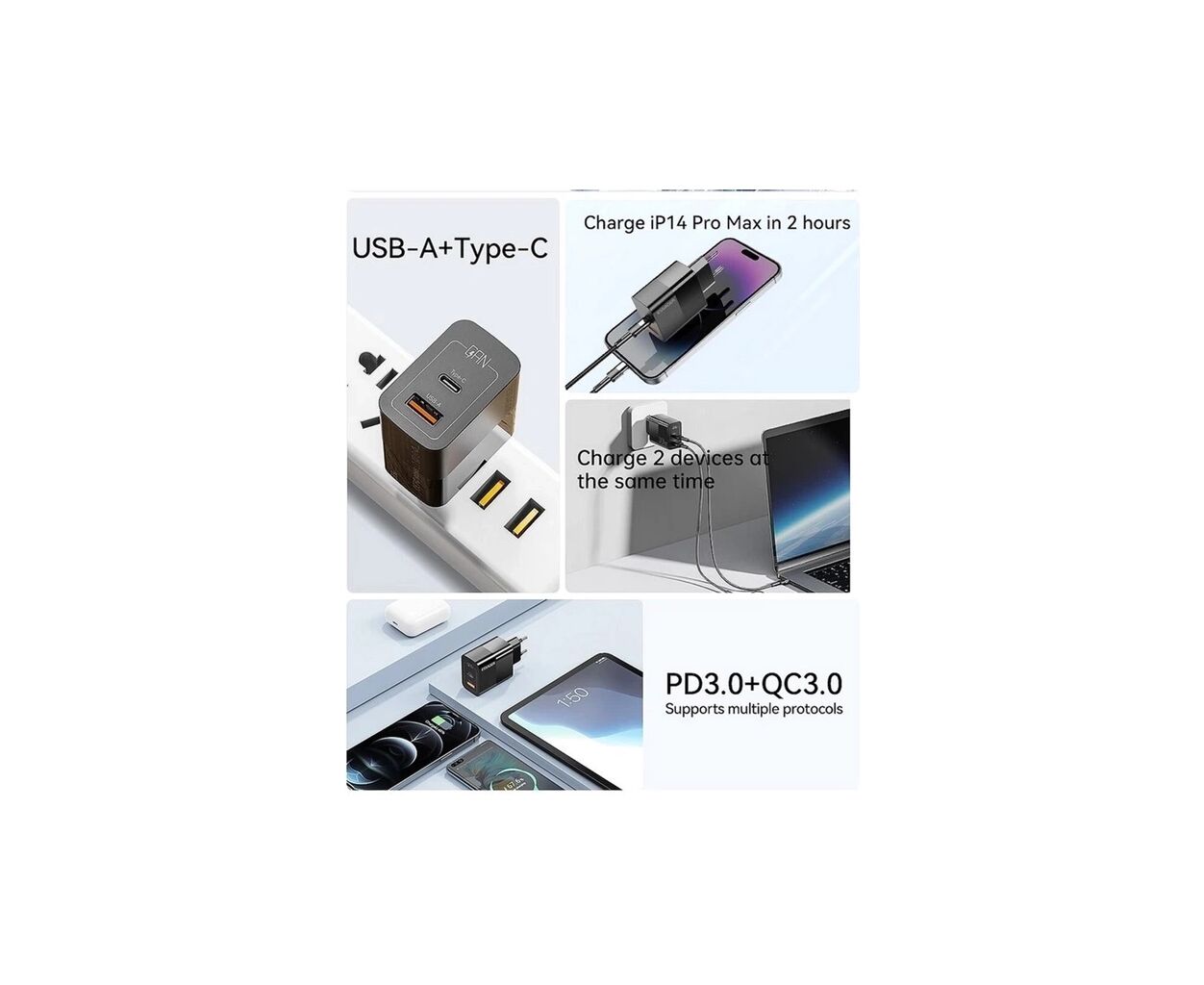 - 2 в 1: Заряжайте 2 устройства одновременно на суммарной мощности до 33 Вт.