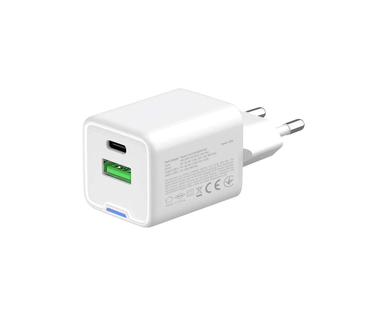 Характеристики Зарядное устройство ColorWay USB-C PD20W + 1xUSB QC4.0 white (CW-CHS062PD-WT)