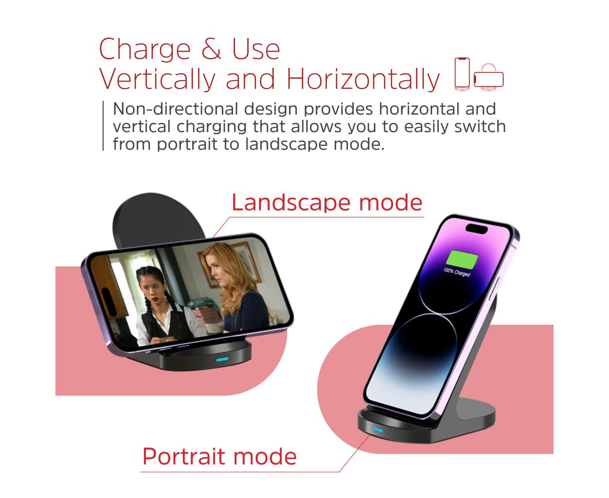 Вертикальная конструкция зарядного устройства позволяет размещать смартфон как в вертикальном, так и горизонтальном положении, что особенно удобно для просмотра сообщений, видео или видеозвонков во время зарядки. Поддержка мощности до 15 Вт обеспечивает быстрое пополнение заряда без потери стабильности.