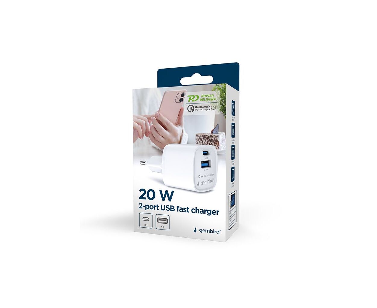 Зарядное устройство Gembird 1xUSB-C PD20W + 1xUSB QC3.0 white (TA-UC-PDQC20-W-01)