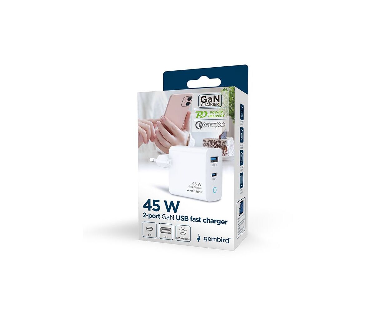 Зарядное устройство Gembird 1xUSB-C PD45W + 1xUSB QC3.0 white (TA-UC-PDQC45L-W-01)