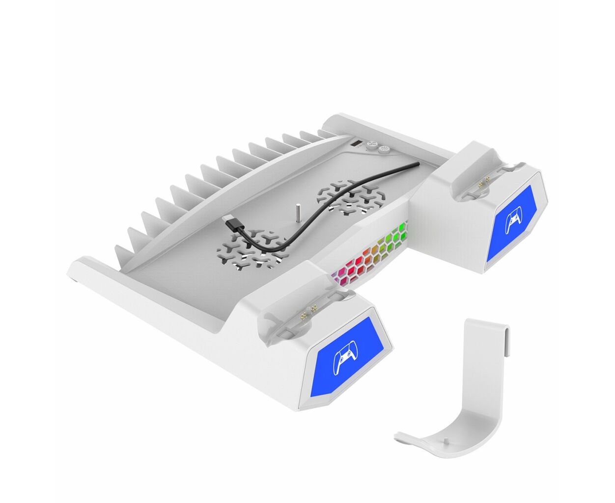 Особое внимание стоит уделить встроенным вентиляторам, которые обеспечивают эффективное охлаждение консоли, продлевая срок ее службы. Световые индикаторы четко информируют о состоянии заряда и режиме работы охлаждения, что обеспечивает полный контроль над процессом. Вертикальная установка поддерживает как PS5, так и PS5 Slim, добавляя устойчивость и эстетичный вид.