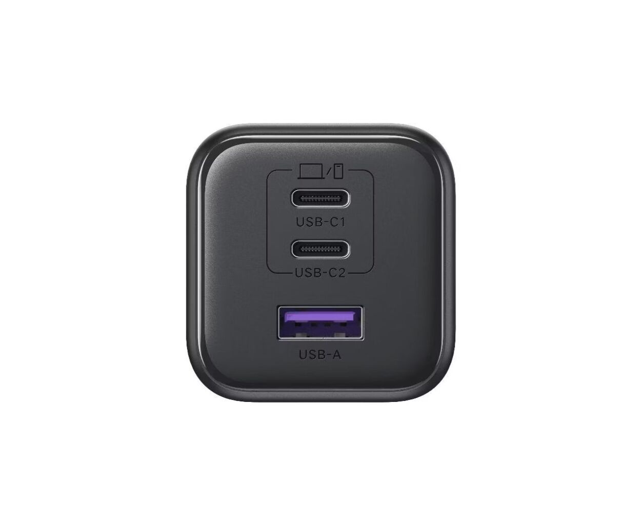 Зарядное устройство оснащено тремя портами: двумя USB Type-C и одним USB Type-A, что позволяет удобно заряжать несколько устройств одновременно. Порты USB Type-C поддерживают быструю зарядку по протоколу Power Delivery 3.0, обеспечивая выходную мощность до 45 Вт при использовании одного порта. Для порта USB Type-A предусмотрена поддержка QC3.0 с мощностью до 22,5 Вт, что позволяет быстро заряжать различные гаджеты.