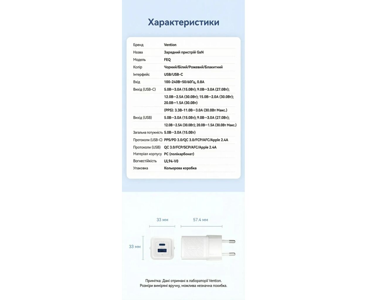 Характеристики Зарядное устройство Vention 1xUSB-C PD30W + 1xUSB QC3.0 30W GaN white (FEQW0-EU)