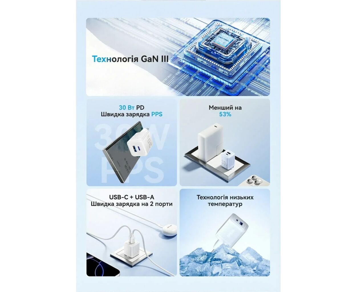 Описание Зарядное устройство Vention 1xUSB-C PD30W + 1xUSB QC3.0 30W GaN white (FEQW0-EU)