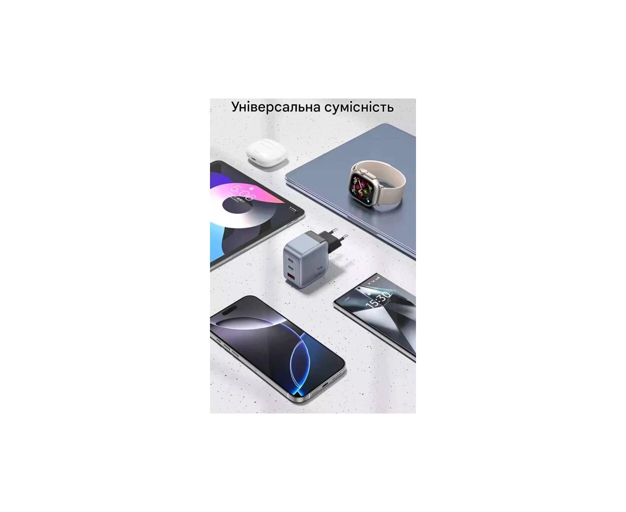 Тип - адаптер, Питание - сеть, Назначение - для планшета, для фитнес-браслета, для раций, для геймпада, для экшн-камер, для смарт часов, для ноутбука, для TWS наушников, для телефона, тип выходного подключения - USB Type-C, USB, Max - 3.5 А, 70 Вт, количество USB портов - 1 x USB, 2 x USB Type C, быстрая зарядка - Programmable PowerSupply (PPS), Quick Charge 2.0, Quick Charge 3.0, длина кабеля - 1 м, серый