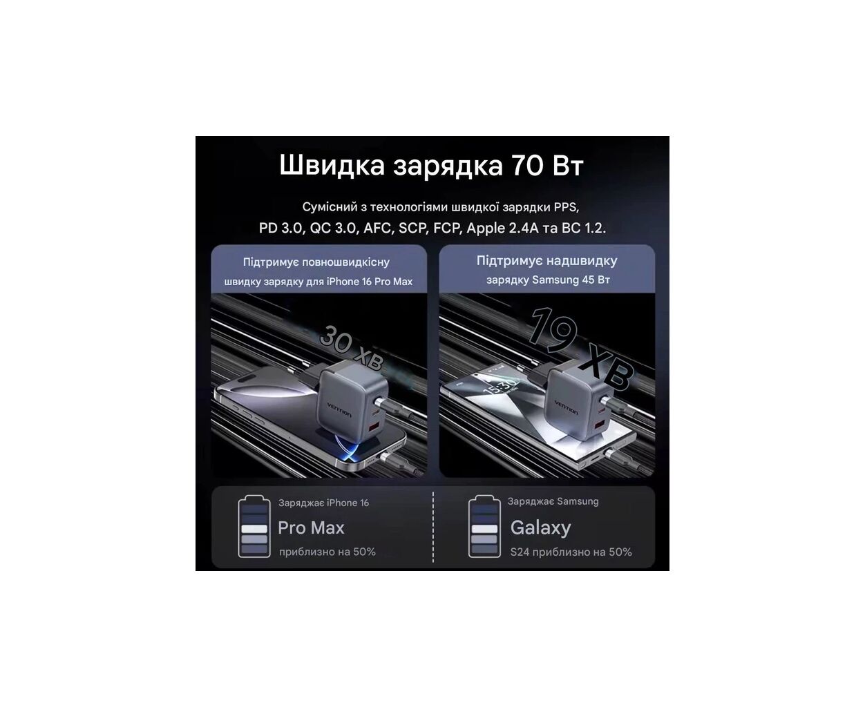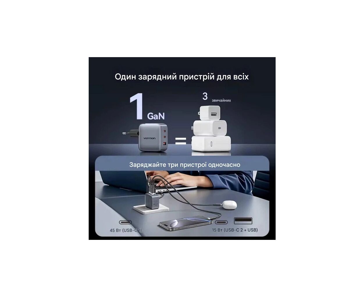 Отзывы о Зарядное устройство Vention 1xUSB-C PD70W + 1xUSB QC3.0 22.5W GaN + cable USB-C to USB-C 1.0m 5A gray (TZ-FCGH0-EU) от реальных покупателей