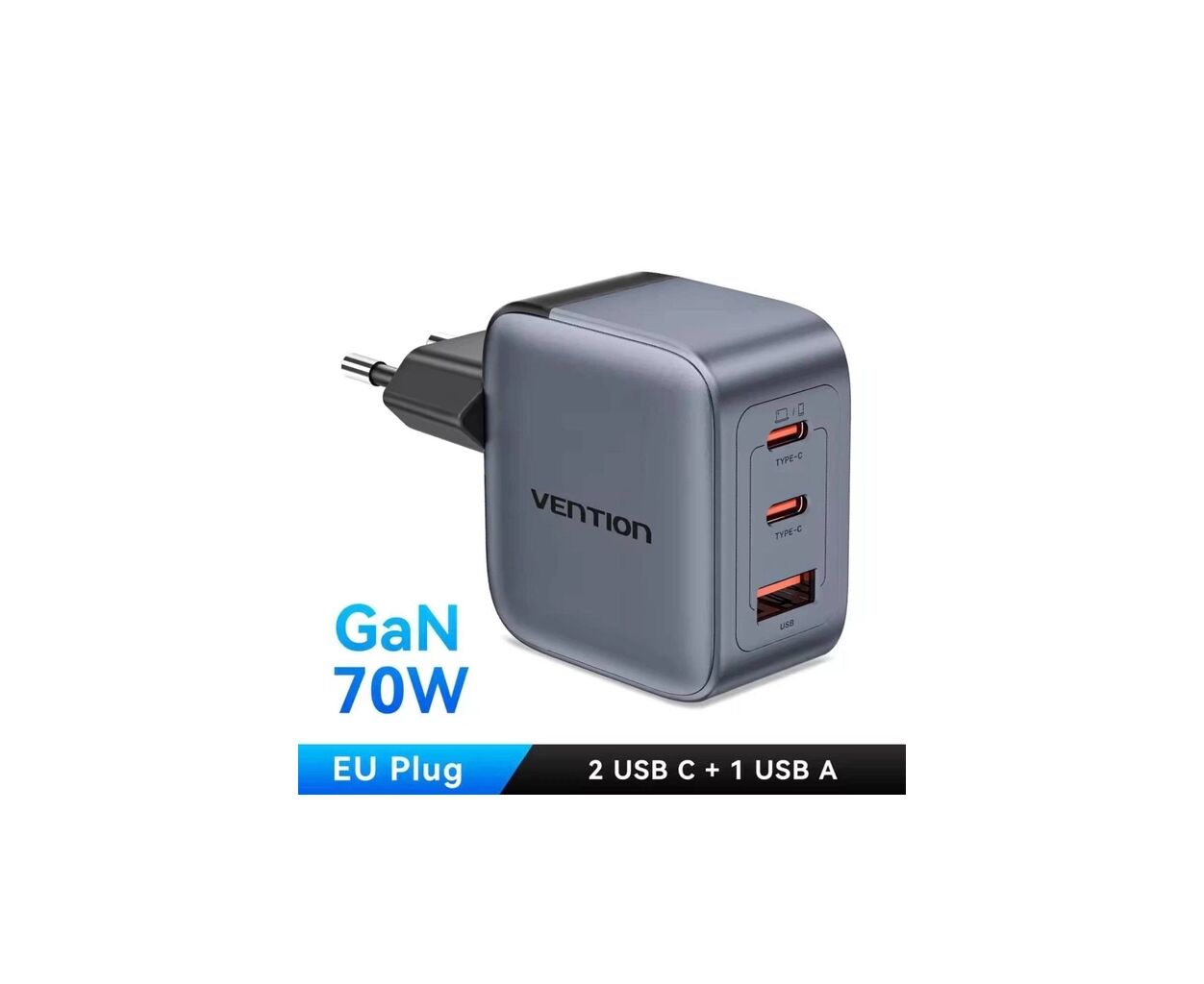 Зарядное устройство Vention 1xUSB-C PD70W + 1xUSB QC3.0 22.5W GaN + cable USB-C to USB-C 1.0m 5A gray (TZ-FCGH0-EU)