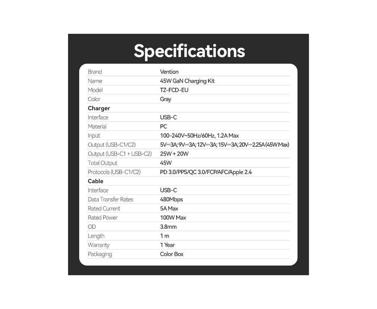Характеристики Зарядное устройство Vention 2xUSB-C PD45W GaN + cable USB-C to USB-C 1.0m 5A gray (TZ-FCFH0-EU)