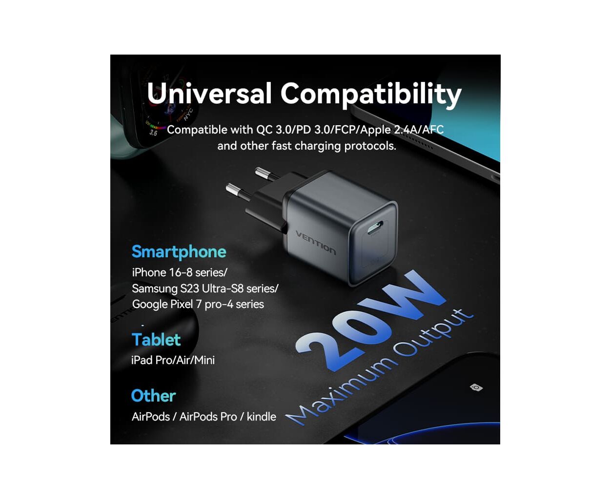 VENTION USB-C PD20W GaN поддерживает широкий диапазон входного тока от 100 до 240 В ~ 50/60 Гц, что подчеркивает его универсальность и готовность работать в любой стране. Компактный форм-фактор и надежная конструкция делают его отличным выбором для использования в различных сценариях.