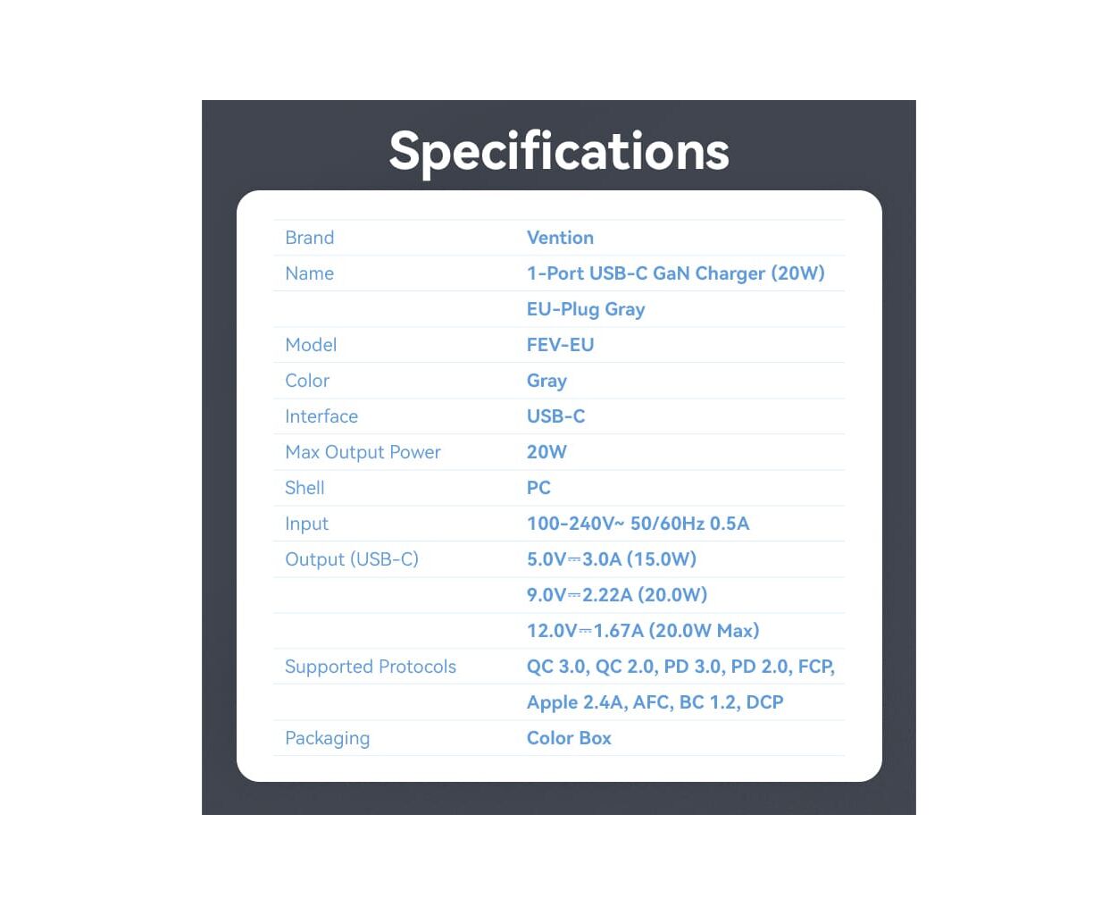Характеристики Зарядное устройство Vention USB-C PD20W GaN gray (FEVH0-EU)