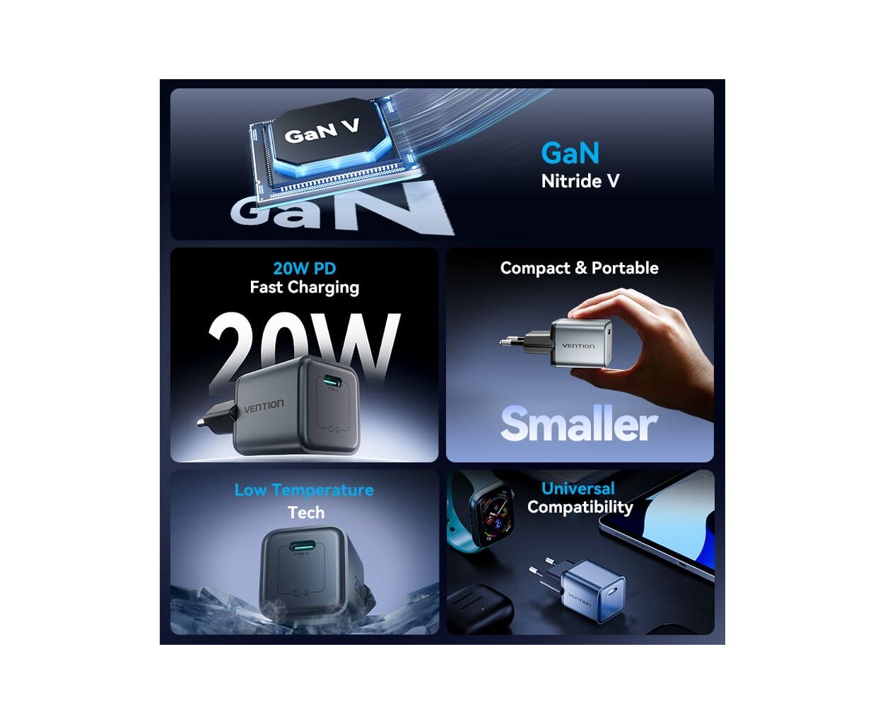 Наслаждайтесь бесперебойной работой всех ваших устройств и чувством безопасности благодаря соответствию высоким стандартам качества и надежности. Выбирая VENTION USB-C PD20W GaN, вы инвестируете в скорость, эффективность и комфорт.